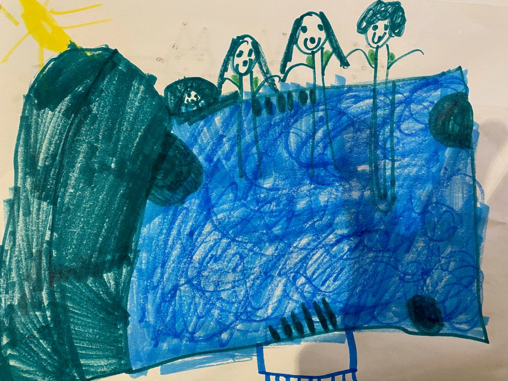 The other day my daughter handed me a picture that she had drawn. It was a picture of her, her dad and I sitting in the hot tub together. She captured a rare moment of the three of us spending quality tome together while Oscar was napping. She was explaining all of the details of the picture and when I asked, “what’s that?” and she said, “the monitor.” It was an awakening moment for me. My husband and my parents have commented on my excessive dependence on the monitor, but now my 5 year old has picked up on it too.